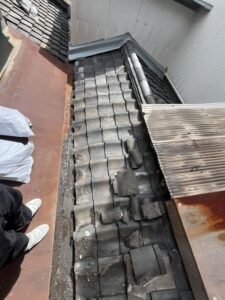 雨漏り調査依頼で見に行かせてもらうと、、、 屋根の谷板部分にどこからか飛んできたであろう シートなどがありました シートが水をせき止め、溜まった水が室内に流れ込む という流れで、ちょうどこの下が雨漏り箇所だったので 撤去、掃除をして完了となりました